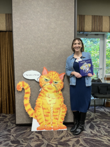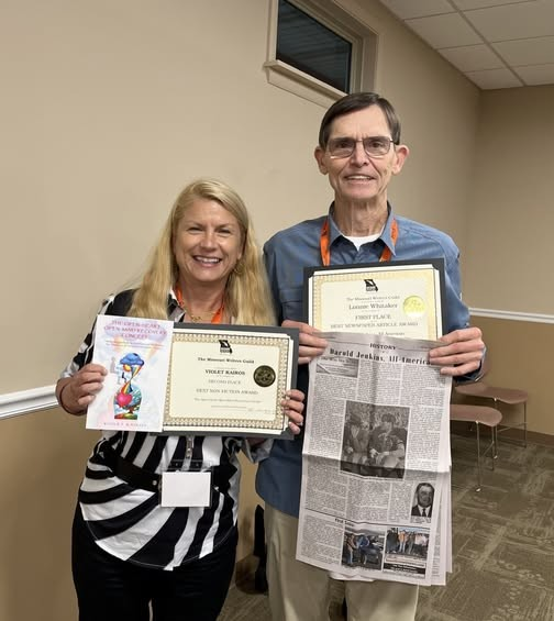 Lonnie Whitaker with Laura Lowry displaying their awards at the Missouri Writers’ Guild Conference in 2024Rose Ramirez, Communication & Marketing Manager for the Writers Colony at Dairy Hollow, at the 2025 Ozark Creative Writers Conference holding her copy of Mulligan Goes to Mars.